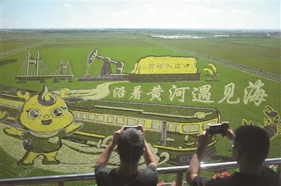 8月30日,游客在山东省东营市垦利区永安镇观看拍摄稻田画。