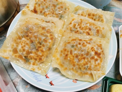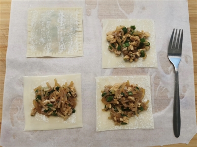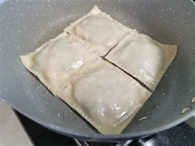 | @燕燕姐小陈 脆皮什锦盒子 用肉末、鸡蛋、粉丝、小葱等炒个馅儿,用大馄饨皮包起来。用叉子压紧边框,小火煎到两面金黄,好吃! |