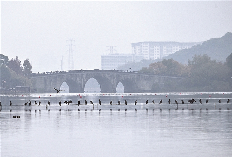 初冬时分,来自遥远北方的候鸟——鸬鹚,宛如天边遗落的音符,优雅地栖息在宁静如镜的湖面,为湘湖这幅静谧的水墨画卷,添上了几分生机与活力。
