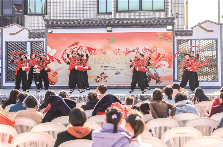 1月4日,戴村镇河杨湖村第二届年俗嘉年华活动火热举行,村民一起看演出、写春联、搡年糕,体验乡村传统民俗,喜迎新年。