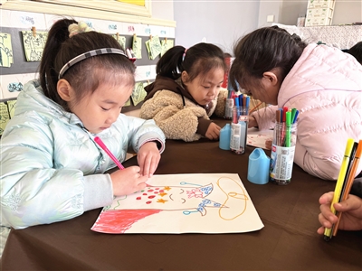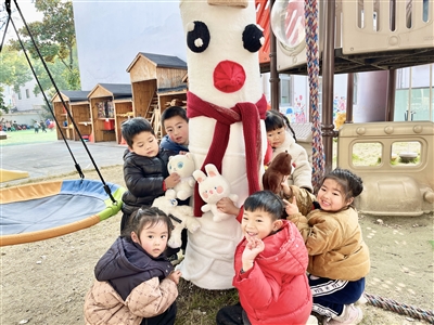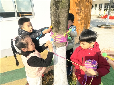 一会儿时间,在孩子们的巧手之下,大树就“穿”上一件件漂亮的毛衣。看到树干上仍有缝隙,孩子们又突发奇想,利用旧玩偶为大树缝补上了漂亮的装饰,五彩的小球、明艳的花朵、俏皮的小人儿……鲜艳的配色和有趣的造型,让一棵棵大树瞬间成了幼儿园里最萌的“时尚宠儿”。它们挺立在寒风中,宛如正在进行一场创意的时装秀,吸引着大家的目光,也温暖了整个幼儿园。
