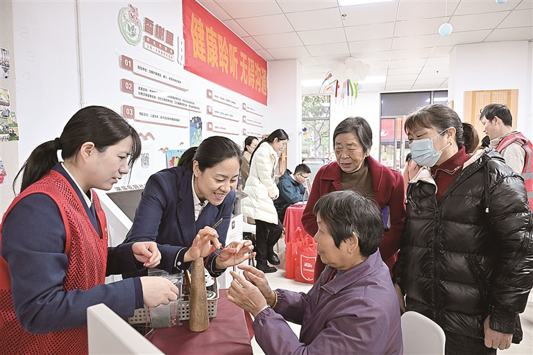 听力检测、手工编绳、理发……昨日,北干街道湖滨花园社区开展“湖”同里便民服务活动,用行动践行雷锋精神。 记者 范方斌 摄