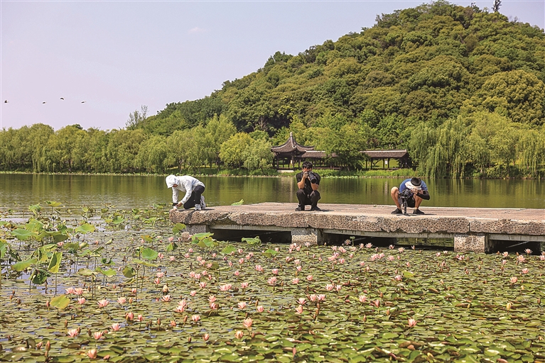 近日,湘湖定山广场的睡莲迎来盛放期,吸引众多拍客前往打卡。翠绿的荷叶铺展于湖面,粉白睡莲点缀其间,宛如绿毯上的宝石。