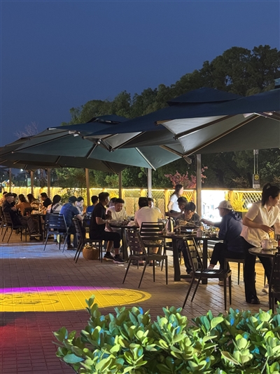 作为首批入驻的“江鲜类”代表餐饮店钱江渔村因主打江鲜而闻名,吸客能力强,包厢预约已经排到了7月份。不仅如此,靠近江堤的一侧,“日咖夜酒”模式经营下的酒吧也颇受大众喜爱。